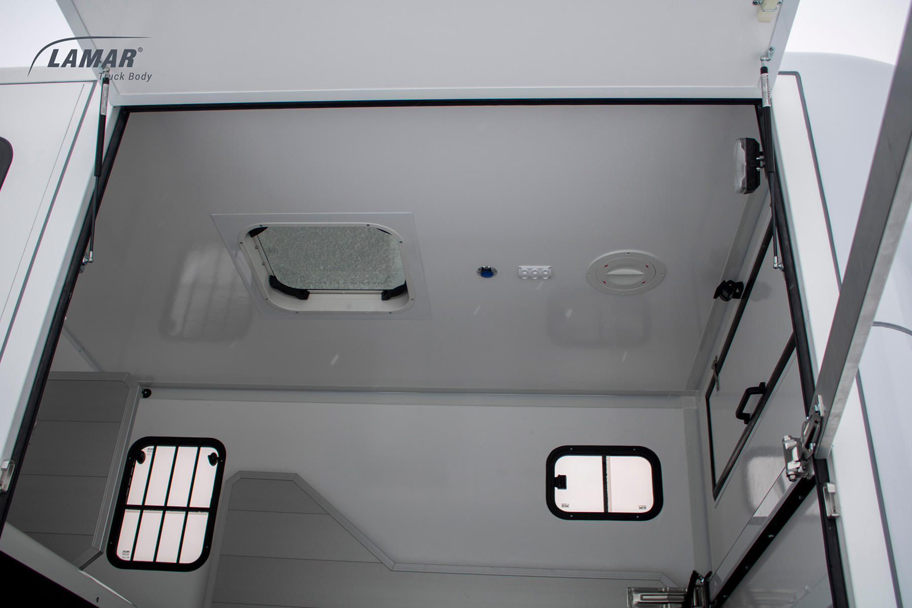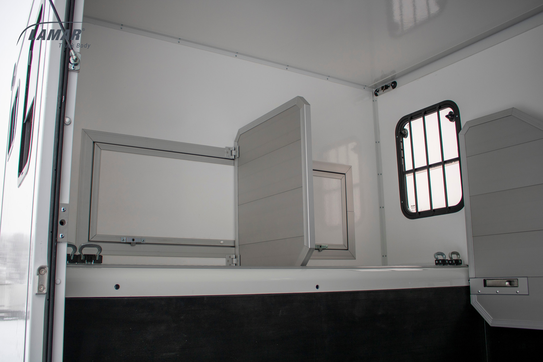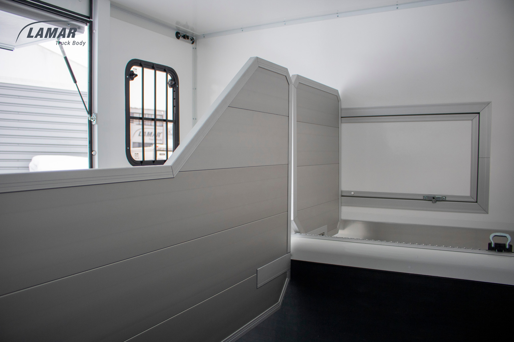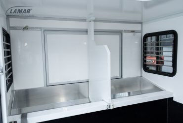 Koniowozy HorseTruck w standardzie zostały wyposażone w przestronne okna w ścianach bocznych oraz dodatkowe okno dachowe. Dzięki temu wnętrze pojazdu przez okres trwania transportu konia wypełnione jest naturalnym światłem. Montujemy również oświetlenie wnętrza LED oraz niebieską diodą dla uspokojenia zwierzęcia w czasie nocnej jazdy. Ściany koniowozu Lambox wykonane z płyt warstwowych typu Sandwich są na tyle trwałe, by sprostać nieprzewidzianym sytuacjom i temperamentowi konia. Komfort poprawia ruchoma i wzmocniona ściana działowa instalowana we wnętrzu. Pozwala ona oddzielić od siebie dwa przewożone wierzchowce i zaplecze akcesoriów. Zapewnia też stabilność całej konstrukcji. W porównaniu z bukmanką koniowóz ma więcej miejsca niezbędnego na paszę i ściółkę.